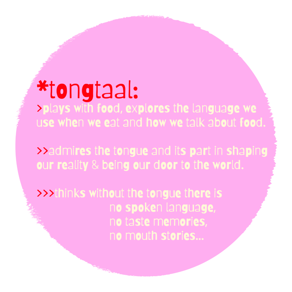 Tongtaal is a playful experiment, an exploration into the rabbit-hole of food, eating and the language we use in any food experience. How sharing food and connective eating, can bring us closer to one another, build empathy, compassion and understanding. Can we create a universal eating language while we explore the hidden/sub-conscious language of our own “tongue-mind” when we eat and greet other cultures??